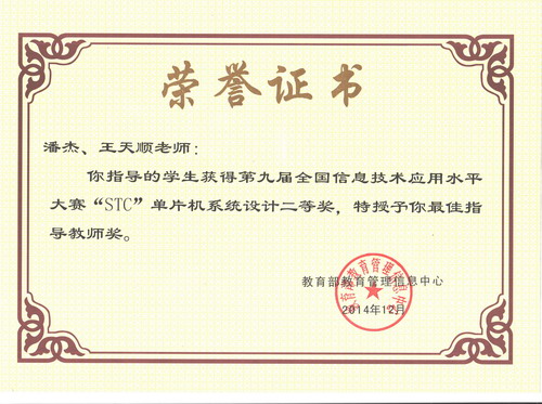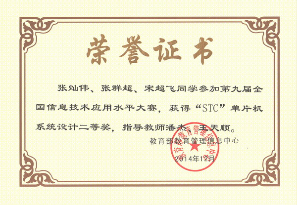 全国信息技术应用水平大赛是一项面向全国大中专院校信息技术及相关专业在校生的全国性竞赛活动,目的是为广大青年员工提供一个展示信息技术应用水平的平台。历届大赛得到了参赛师生的广泛好评,取得了良好的社会效果。今年大赛有来自全国31个省、自治区、直辖市的703所院校积极组织参赛,参赛团队总数为5467个。信工系从今年5月份组队报名伊始,院系领导就对本次比赛高度重视。李学桥主任亲自为员工做赛前动员,指定潘杰老师为大赛总教练,王天顺、盛光磊、贾伟娜、夏冰为大赛指导教师。各位老师放弃暑假休息时间,加班加点,制定了详细的暑假训练计划。经过近半年的努力,最终有8只队伍做出了完整的作品,成功参赛。其中12电信班的宋朝飞同学设计的基于单片机出租车多功能计价器,设计合理,功能先进,对现有出租车计价器进行了一定的创新和改进,受到大赛评委会的一致认可,荣获全国二等奖。