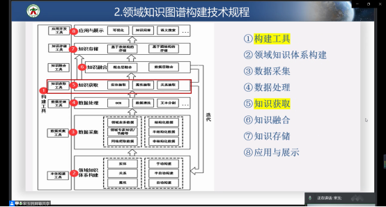 宋玉副教授首先介绍了知识图谱的发展历程,由最初的语义网络到本体论、万维网、语义网再到链接数据,进一步发展为知识图谱。详细介绍了大数据时代给知识图谱发展带来的新机遇,知识图谱是理性主义的最新成功实践,是下一代人工智能的基础设施,是实现可解释人工智能的重要手段。其次介绍2021年3月郑州大学联合企业制定的《领域知识图谱构建规程》、实体及关系标注平台的创建、迁移学习等相关先进算法的介绍。最后详细介绍医疗领域知识体系构建、期货领域知识图谱及事理图谱、时政事件知识图谱等具体方面的应用。