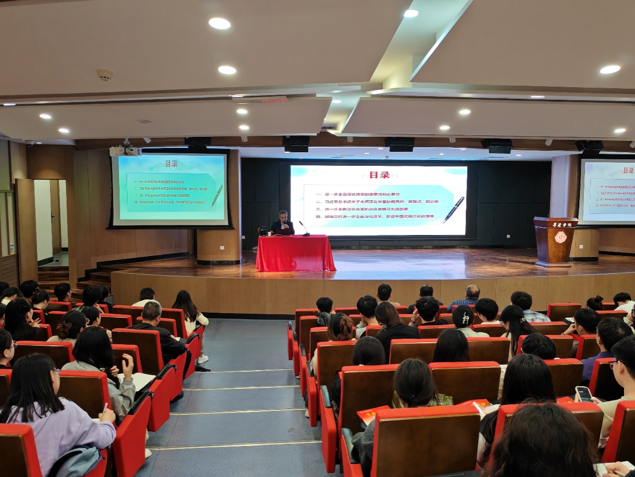 讲座上,郑发展教授从“进一步全面深化改革的重要性和必要性”、“习近平总书记关于全面深化改革的一系列新思想、新观点、新论断”、“进一步全面深化改革的总体思路与系统部署”、“提高党对进一步全面深化改革、推进中国式现代化的领导水平”四个方面对党的二十届三中全会精神做解读。