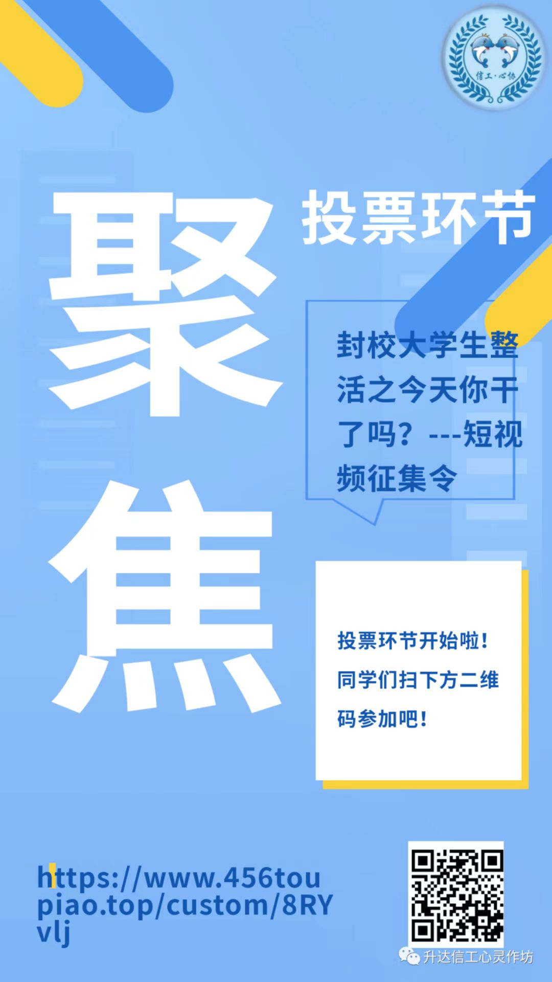 活动要求同学们在规定时间内将原创短视频发送至“升达信工心灵作坊”微信公众号平台。经过一轮评委评选后,选出十个优质短视频,进行公众投票。根据投票结果评选出一等奖一名,二等奖两名,三等奖三名。