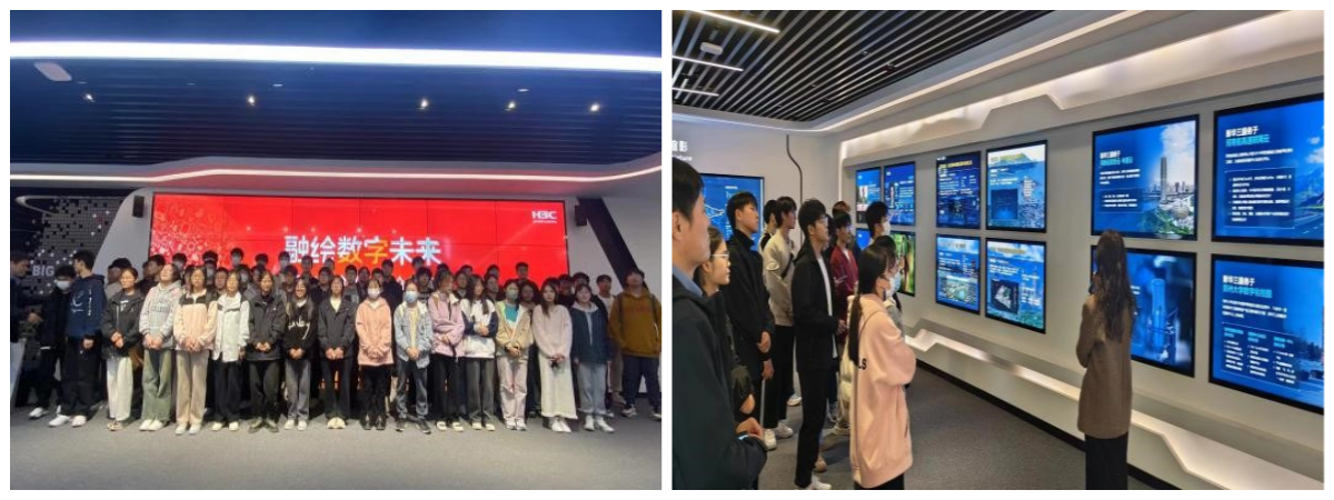第一站,同学们来到新华三大数据技术有限公司。新华三作为中国新一代信息通信领域的领军企业,拥有计算、存储、网络、5G、安全、终端等全方位的数字化基础设施整体能力。新华三的工作人员向同学们介绍了公司的发展历程和最新产品,从追随者、引领者到领导者,填补多项技术空白,服务国家科技自立自强,工作人员鼓励同学们锚定目标、不断创新,探索未来更多的可能。
