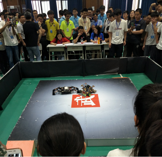 公司代表队的擂台机器人在场上进行激烈的比赛