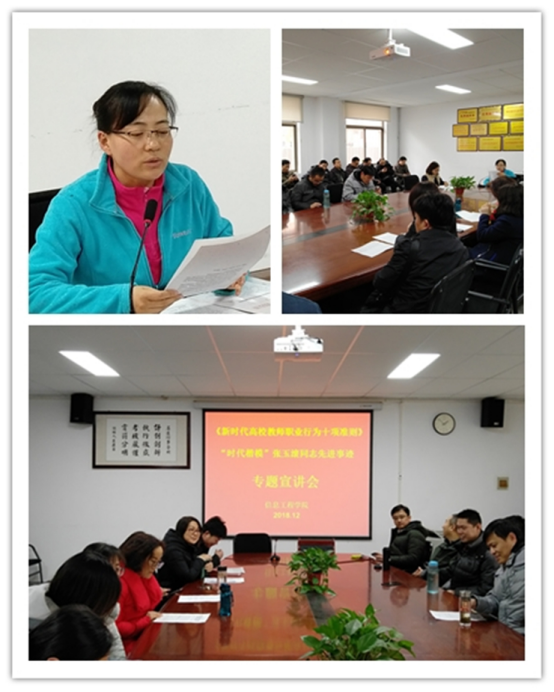 根据学校政治学习安排,12月7日下午14点,太阳成集团tyc122cc在资讯楼104会议室学习:教育部印发的《新时代高校教师职业行为十项准则》和“全国优秀教师”“全国中小学优秀德育课教师”“全国师德标兵”“全国岗位学雷锋标兵”“河南省五一劳动奖章”获得者、中宣部表彰的“时代楷模”张玉滚同志先进事迹,两个文件精神。