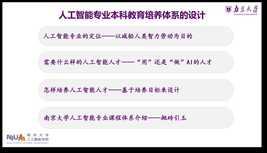 大会邀请了13位分别来自中国科学技术大学、南京大学、中南大学、哈尔滨工业大学、武汉大学、浙江大学、厦门大学、西安邮电大学等高校和企业界的知名学者、技术专家分享了围绕大数据与人工智能教学的报告。其中南京大学人工智能学院申富饶教授做了主题为“南京大学人工智能本科专业教育培养体系的设计”的报告,该报告从人工智能专业的定位、需要什么样的人工智能人才、怎样培养人工智能人才和南京大学人工智能专业课程体系介绍四个方面来分享南京大学人工智能专业特色定位“夯实基础--深化专业--复合知识--加强实践”。