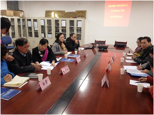2015年11月30日下午,信息工程系与河南龙翔电气有限责任公司校企合作签约仪式在资讯大楼系会议室举行。参会嘉宾有河南龙翔电气有限责任公司校企合作中心主任陈伟兰,副主任李西明,郑昌才、方贝;信工系主任李学桥教授、党总支王新平书记、教学秘书白鑫老师、行政秘书张娟老师,实验室主任张从知老师,副主任潘杰老师及各位辅导员老师参加了签约仪式。