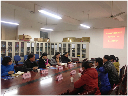 签约仪式由张娟老师主持,首先,郑昌才副主任介绍了河南龙翔电气有限责任公司的发展历程,发展规模以及当前电气行业发展的前景。他表示在和高校建立校企合作的模式中对于龙翔电气公司发展起到了积极的推动作用,通过合作更好的利用团队参与到教学,把教学与实践相结合,争取在未来进行广泛的项目研发,项目维护等方面的合作。