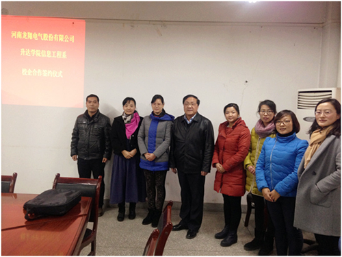 接着,系主任李学桥教授介绍了创办人的办学理念,升达学院的基本情况,学院的管理理念、教学理念以及在校生的基本情况。李主任着重介绍了信工系建系以来的基本情况,从团队队伍,科研水平,获得的荣誉,近年来考研考证的成绩等相关方面。从李主任的言语中能够深深的感受到李主任对员工就业情况的关心与关注。李主任希望河南龙翔电气有限责任公司和我系的合作能够达到预期的效果,充分利用双方优势资源,真正共同培养出高素质,实践性创造性强的优秀毕业生。随后,双方签订校企合作协议,李主任和王书记代表信工系向陈主任等一行赠送礼品(创办人书籍)并与会人员合影留念。
