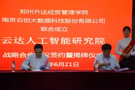 2019年6月21日,公司与南京云创大数据科技股份有限公司联合成立云达人工智能研究院,并与公司双创大讲堂隆重举行战略合作协议签约暨揭牌仪式,本次合作受新郑市政府高度重视。公司董事会执行董事王新奇博士,吴益民副董事长,太阳成集团tyc122cc经理李学桥教授,副经理白鑫副教授和南京云创大数据科技股份有限公司总裁刘鹏教授出席了本次签约暨揭牌仪式,该仪式有副董事长吴益民教授主持。