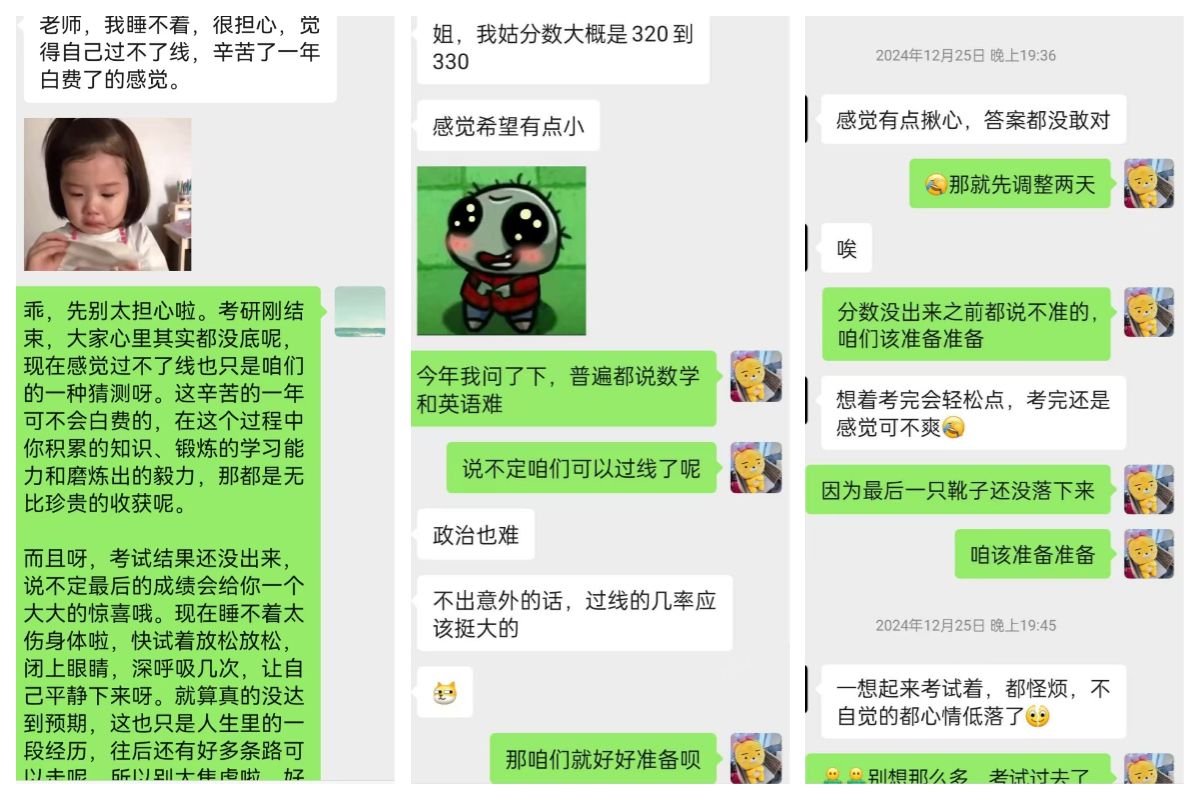 数字化浪潮下,线上交流更是畅通无阻。深夜时分,当失眠的焦虑笼罩着部分考研生,辅导员的私聊窗口适时亮起。一位同学在透露内心的恐慌,担心付出付诸东流,不出几分钟,辅导员就发出长长的回复,为黯淡的心情注入光亮,让屏幕这头的员工重拾信心。