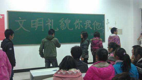 活动共分为三个部分。第一部分:各班代表回答评委提出的有关文明礼貌的情景模拟,各班代表认真回答出自己认为的最文明的做事方式,并且在台上进行了贴近生活的表演。活动第二部分是猜成语比赛:一人比划一人猜,时间限制一分半。选手通过肢体动作,向搭档传递所看到的成语信息。其中那些搞笑奇怪的动作和趣味回答,使在场的观众在轻松愉快的氛围中学习了有关文明礼貌的成语知识。最后一个环节是团体比赛:每班五人每组猜一段话。一人看完表演传达给第二个人,以此类推第五个人猜表达的是什么,期间不能说话。精彩的表演获得了大家阵阵掌声。穿插在活动中的歌曲“月亮代表我的心”和“我们一起跳江南style”非常给力,整个活动在大家的欢声笑语中圆满结束。