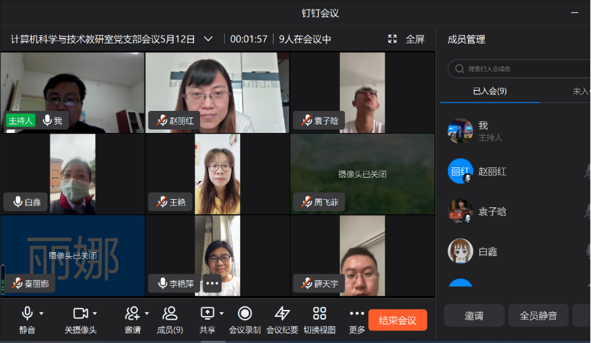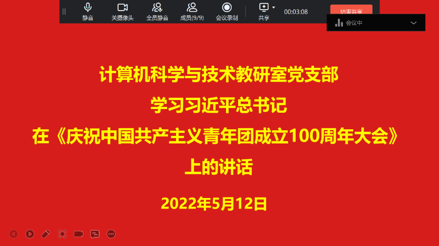 2022年5月12日中午12:00,太阳成集团tyc122cc计科教研室党支部举行线上专题学习会,深入学习习近平总书记在庆祝中国共产主义青年团成立100周年大会上的讲话精神,专题学习由支部书记王天顺主持。
