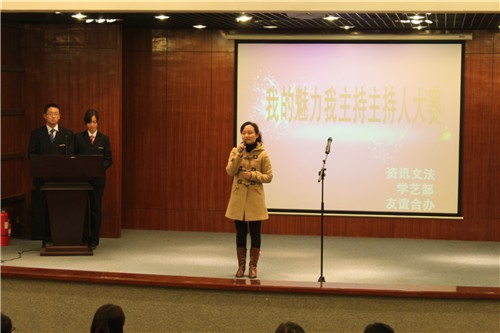 首先,郑玲玲老师为比赛致开场词。她对组织此次比赛的两系团学干部的工作表示肯定和赞扬,并借用弗朗西斯·培根的名言和形象生动的事例指出资讯、文法两系专业的互补性有益于两系员工互相取长补短,共同学习和提高;同时郑老师指出主持人大赛等校园活动在锻炼老员工综合素质方面的积极意义,鼓励大家在搞好学习的基础上积极参加校园活动,最后郑老师对两系今后员工活动的合作提出了新的希望和期许。