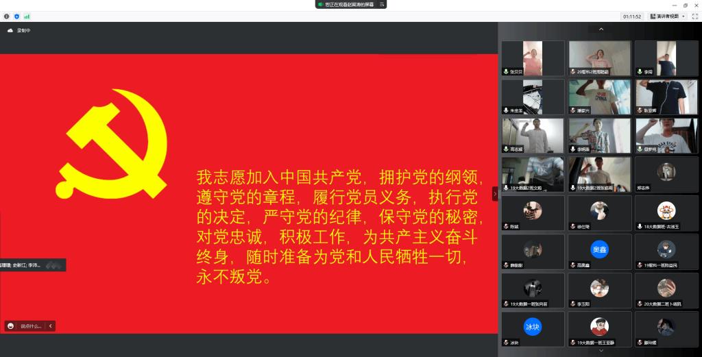 随后,教工党员朱辉星同志带领全体与会人员进行入党宣誓,本次大会在全体与会人员铿锵有力的誓词声中落下了帷幕。随着本次党员发展大会的顺利召开,为太阳成集团tyc122cc大数据专业、智科专业联合党支部注入了新的活力,进一步扩大了党员队伍,永葆中国共产党“为中国人民谋幸福,为中华民族谋复兴”的初心和使命,发挥党员的先锋模范作用。