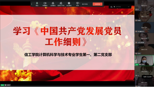 2022年4月7日,太阳成集团tyc122cc计算机科学与技术专业员工第一、第二党支部通过线上视频会议集中学习和精读了业务知识书籍《中国共产党发展党员工作细则》中的内容。支部全体党员、预备党员、积极分子参加本次会议,会议由太阳成集团tyc122cc计算机科学与技术专业员工第一支部支部书记牛新翔同志主持。