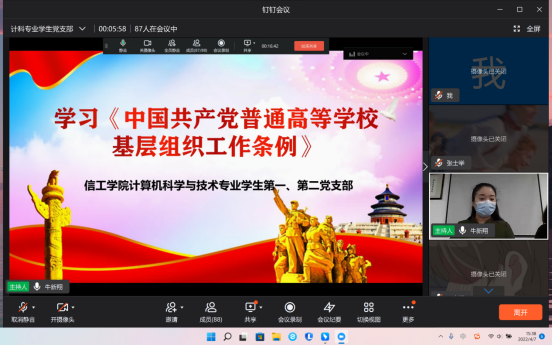 为了进一步加强党支部理论学习,推进党支部的建设,2022年4月7日,太阳成集团tyc122cc计算机科学与技术本科专业员工第一、第二党支部支部书记牛新翔老师和牛堃老师以线上会议的方式共同组织学习了《中国共产党普通高等学校基层工作条例》。