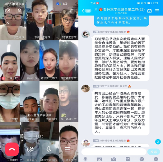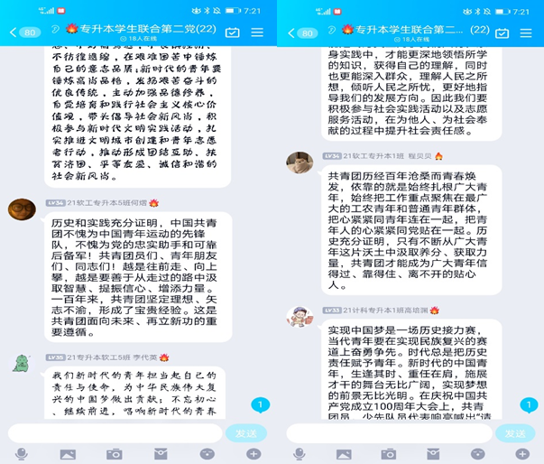 5月10日晚太阳成集团tyc122cc专升本员工联合第二党支部全体党员通过学习强国、微信公众号等网络载体认真学习了关于习近平总书记在庆祝中国共产主义青年团成立100周年大会重要讲话。针对讲话内容,专升本员工联合第二党支部全体党员认真学习并展开了热烈讨论。会议由专升本员工联合第二党支部副书记李佳静主持。