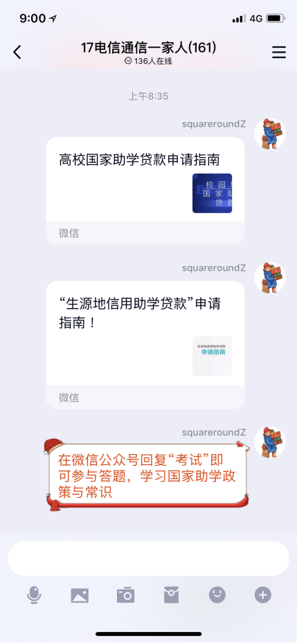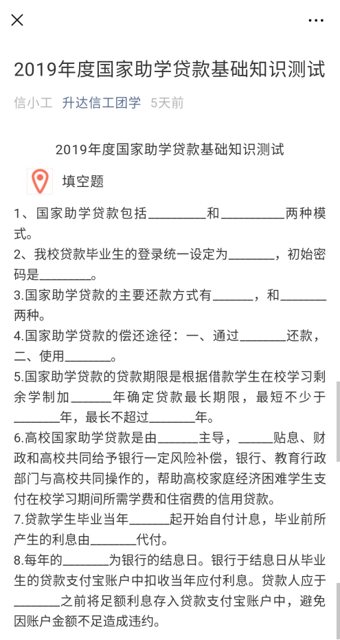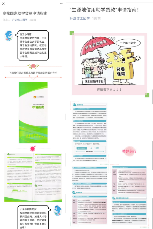 2、5月20日-27日利用学院公众号进行线上宣传,分别对国家生源地助学贷款、国家校园地助学贷款流程做了详细介绍,加深员工对国家资助的了解和普及。同时利用学院微信公众号进行回复“考试”,进行网上资助答题,以丰富多样的形式进行前期宣传教育工作,让在校生同学都能学习国家助学贷款的相关知识。