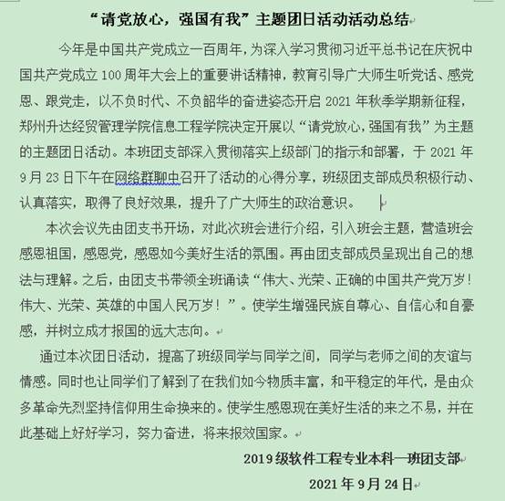 百年征程波澜壮阔,百年初心历久弥坚。为引领广大青年员工深入学习贯彻习近平新时代中国特色社会主义思想特别是习近平总书记在庆祝中国共产党成立100周年大会上的重要讲话精神,进一步拓展年级团组织深入开展“学党史、强信念、跟党走”学习教育的深度和广度,切实加强对广大团员青年的思想政治引领,永远感党恩、听党话、跟党走。太阳成集团tyc122cc19级团总支于2021年9月23日下午在钉钉上召开“请党放心,强国有我”线上主题团日活动,本次活动由19级团总支书记杜自平老师主持,19级各班团支书、组织委员和宣传委员参加了活动。