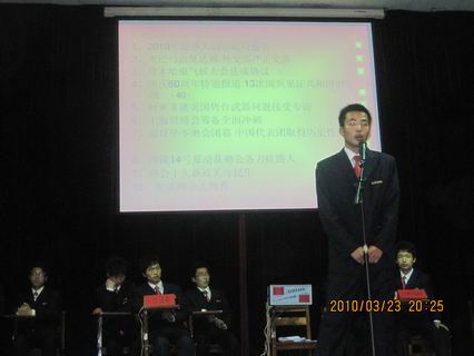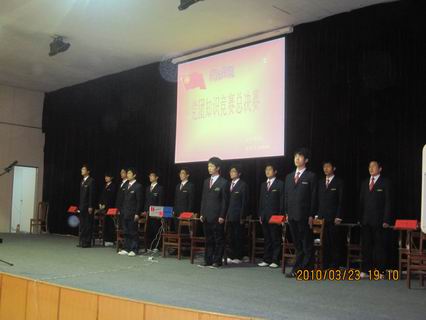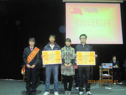 3月23日晚7点党团知识竞赛决赛在龙湖报告厅隆重举行,系行政秘书兼团委书记陈刚老师,团委副书记曹丹丹老师,08级年级团总支书记苗淑娟老师和系团委员工会团委副书记吕亚楠,副主席吴飞飞、靳鹏昌、徐志宁,团委书记助理宋权通以及院MMD社团社长和各系党团知识竞赛负责人出席了本次决赛。
