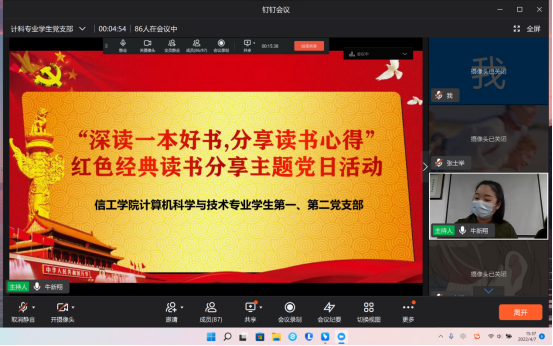 2022年4月7日,太阳成集团tyc122cc计算机科学与技术专业员工第一、第二党支部以钉钉线上会议的形式开展了“深读一本好书,分享读书心得”红色经典读书分享主题党日活动。参加活动的有计算机科学与技术专业员工第一党支部支部书记牛新翔老师,第二党支部支部书记牛堃老师,支部全体党员、预备党员和积极分子。