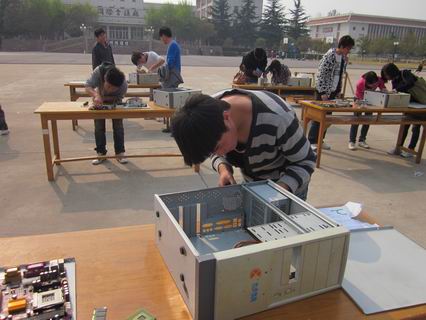 比赛开始后,选手们迅速有序地将散落在桌子上的电脑部件安装到电脑机箱的准确位置,比赛紧张的进行着。或许是天气有些热,也或许是比赛紧张的气氛感染了选手,他们的手心和额头都渗出了汗珠,但是选手们顾不上这些,他们的注意力全在每个小小的零部件上。终于,在大家的欢呼声中各组完成了各自的组装任务,此时,选手们才用手拭去汗水,露出满意的微笑。在比赛的场地周围,还设置了一些展台,展示着一些电脑方面的知识和电脑零部件,使同学们对电脑的认识更深入了一步。一些互动游戏更是让同学们踊跃地参与其中,大呼过瘾。经过激烈角逐,最终资讯系田永坤同学获得一等奖,吴林军、朱小凯获得二等奖,刘程龙、周亚东、梁世飞获得三等奖。