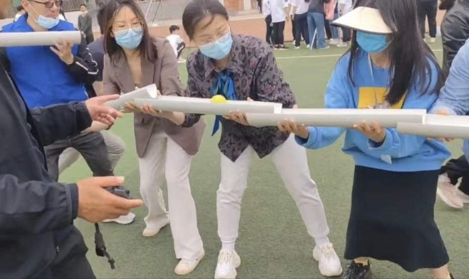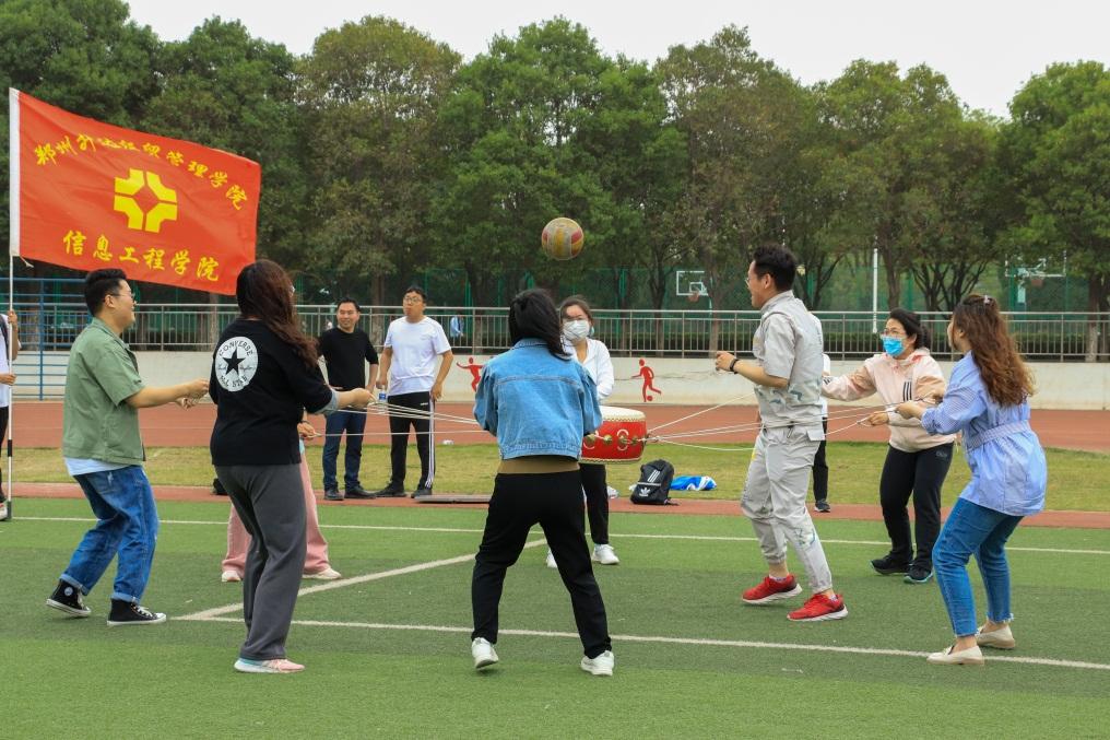 同心鼓团队比赛热火朝天的进行着,参赛者精神抖擞,大家为了接球颠球一起前进,后退。珠行万里团队赛中,参赛老师全神贯注,紧盯小球动向,快速接上。这些团队比赛非常考验大家的默契程度,运动员不仅要时刻观察其他队友,还要默契配合他人,每位运动员脸上都洋溢着开心的笑容,学院其他老师的加油呐喊声此起彼伏。