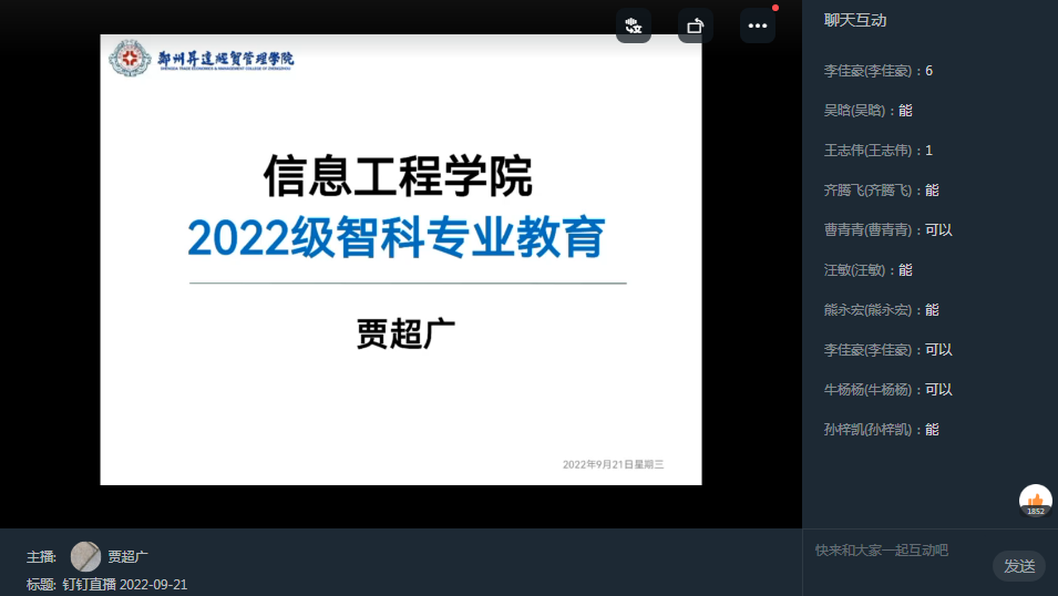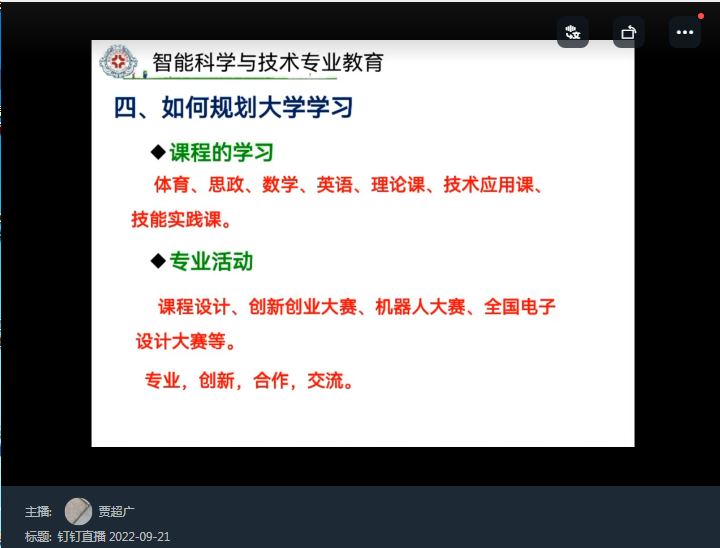 9月20日太阳成集团tyc122cc的新生入学报到,9月21日下午智能科学与技术教研室主任贾超广副教授对该专业员工通过网络进行了专业教育。