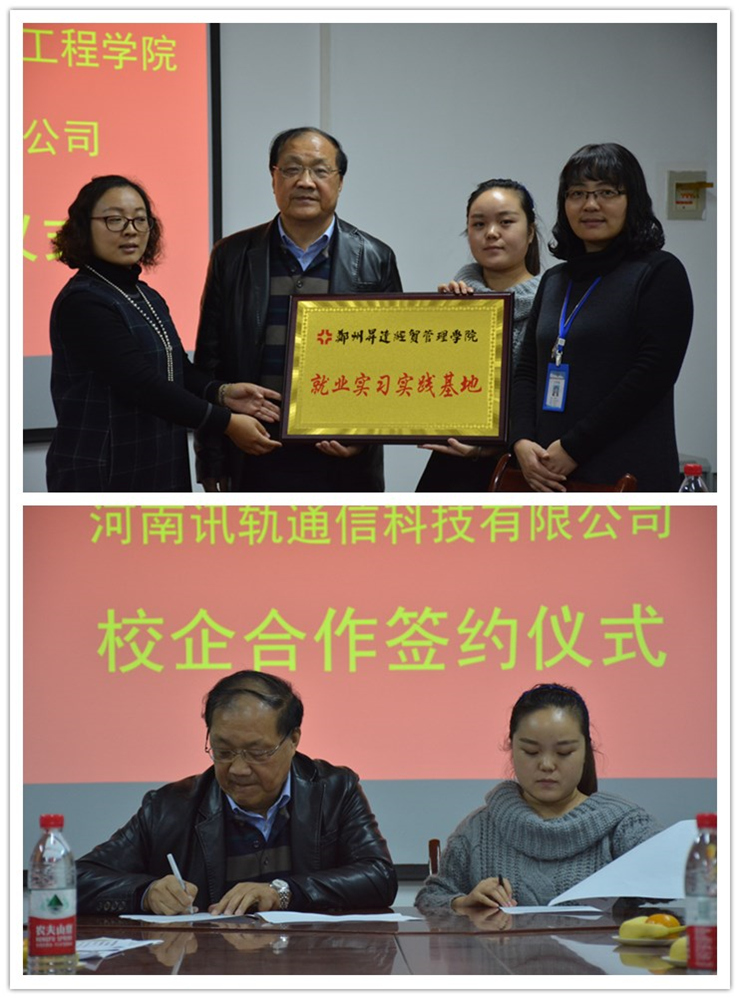 2017年11月9日,公司与河南讯轨通信科技有限公司校企合作签约仪式在资讯楼104会议室举行。太阳成集团tyc122cc经理李学桥、党总支书记王新平、副经理白鑫、河南讯轨通信科技有限公司人事经理白亚芬参加了签约仪式。签约仪式由18级就业专业袁奉亚主持。