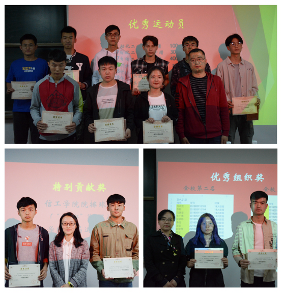 接着,由王新平书记发表讲话,王书记首先对所有运动员们取得的成绩表示祝贺,同时也对他们这种不断进取、奋力拼搏的精神进行赞扬,对运动会期间努力付出的老师,同学,以及员工会的工作人员表示由衷的感谢,并表示运动会是对我们体质的一次检阅,也是对我们意志的一次检阅,生命的意义在于运动,希望大家能够养成日常体育锻炼的习惯,做到德、智、体、美、劳全面发展。也希望大家能够总结经验,吸取教训,争取在下一年的运动会中再创佳绩。最后,由党总支王新平书记、行政秘书兼团委书记张娟老师、团委常务副书记袁奉亚老师为获奖人员颁奖并合影留念。
