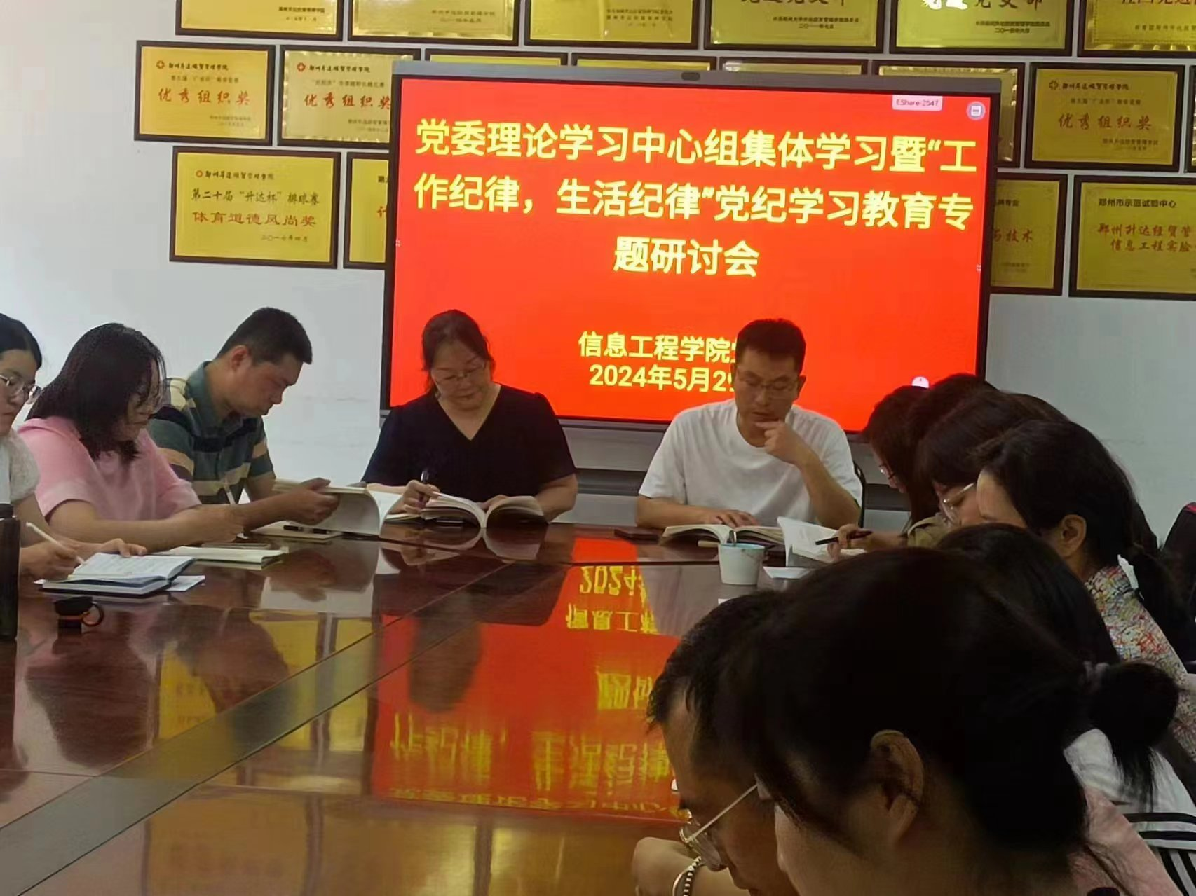 为推动党纪学习教育走深走实,提升广大党员干部遵规守德意识。5月29日下午,信息工程公司党委理论学习中心组(扩大)学习围绕“工作纪律、生活纪律”开展集体学习研讨。本次会议由公司党委书记李赵法主持,党委中心组成员及各支部书记参加会议。