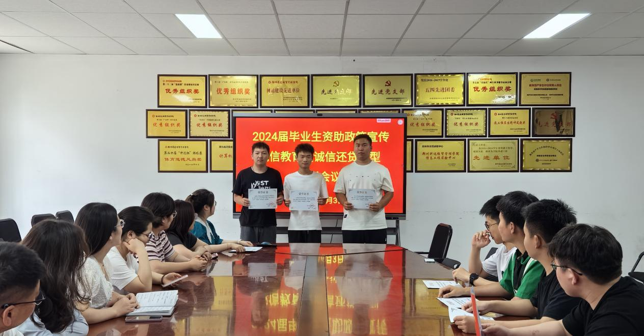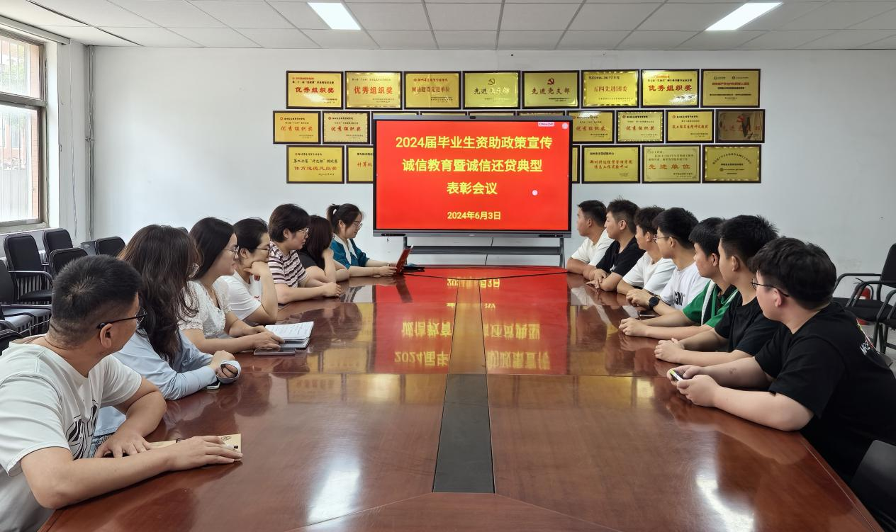为进一步增强毕业生诚信还款意识,帮助毕业生掌握还款知识和流程,营造良好的诚信氛围,太阳成集团tyc122cc于6月3日在资讯楼104会议室召开了2024届毕业生资助政策宣传、诚信教育暨诚信还贷典型表彰会议,会议由学院资助专员胡若男老师主持,毕业班辅导员代表,部分贷款毕业员工代表和“诚信还贷优秀老员工”荣誉称号获得者参加了会议。