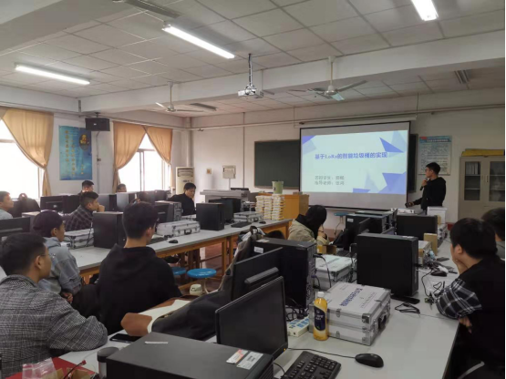 最后,两位参加过物联网大赛并获取奖项的路畅和高可鹏同学,为全班同学进行了模范演示,讲解了作品系统的设计思路、实现途径和方法技术,并进行了作品演示,获得了同学们的热烈掌声,极大的鼓舞了同学们的士气和信心。