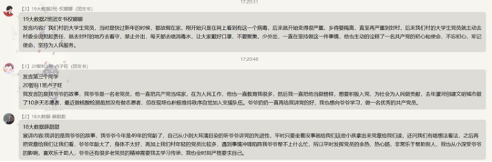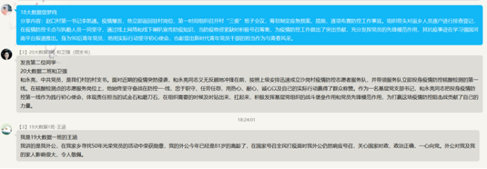 当然,还有18大数据、19大数据和20智科班的同学们分享了家里的爷爷,外公等长辈,身为老党员积极响应国家号召、关心国家时政、一心向党,为后代人讲述中国共产党的新先进性,也用自己的思想行动影响着一代人。