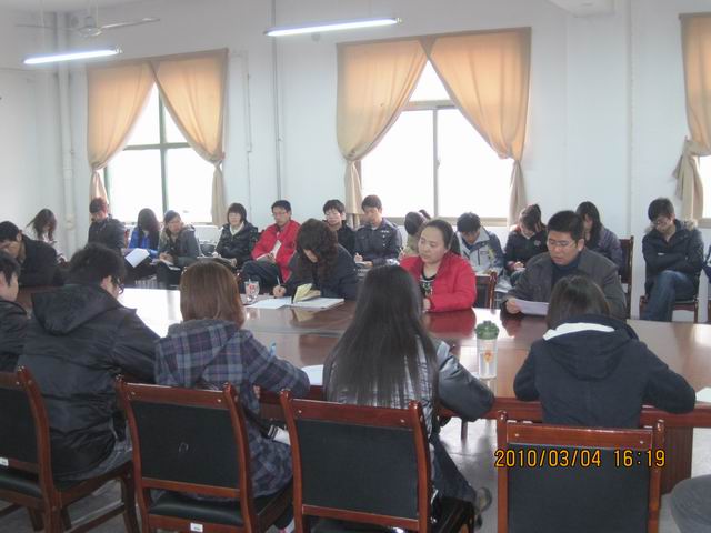 会议首先由陈刚老师就上学期的工作作了全面的总结,并提出了本学期的工作重点,同时也对大家提出了要求和希望。他要求大家要在工作当中培养四个力:活力、合力、能力、魄力。树立政治意识、责任意识和服务意识,在工作过程中养成良好的作风。各部门的工作实行分工负责制度,做到分工明确,责任到人,各个部门之间加强团结,配合协作。在工作中要做到严格要求,追求效率和质量。