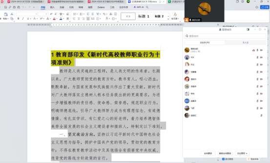 随后,与会教师围绕《新时代高校教师职业行为十项准则》进行了深入学习和讨论。大家一致认为,准则从坚定政治方向、自觉爱国守法、传播优秀文化、潜心教书育人、关心爱护员工、坚守廉洁自律、积极奉献社会等方面,对教师职业行为提出了明确的要求和规范,是新时代高校教师职业道德建设的重要遵循。