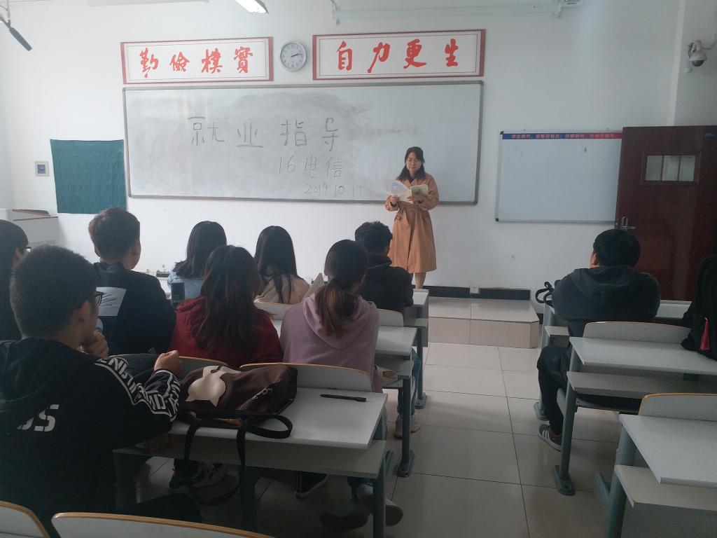 太阳成集团tyc122cc2016级同学们的在校学习时间即将结束,马上要进入到找工作阶段,很多同学感觉比较迷茫。根据学院安排,王丽娟老师于10月18日召开了16电信1班的“就业指导”专题班会。针对如何制作简历,筛选就业单位,积极提升面试技巧等方面进行了指导。给同学们拓宽了找工作的思路,一是要主动出击,积极筛选合适的单位和岗位。二是要多调研,针对岗位要深入了解。三是在找工作的过程中同时提高自己是专业素养。