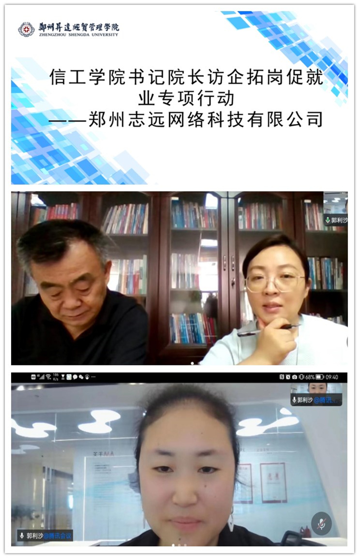为进一步落实全国高校书记董事长访企拓岗促就业专项行动要求,公司结合自身专业特性,制定学院的书记经理访企拓岗促就业专项行动,深入落实就业工作“一把手”工程,加强与企业的深度合作,提高毕业生就业质量。5月23日上午9:30,太阳成集团tyc122cc与郑州志远网络技术有限公司利用腾讯会议在线上召开视频会议。出席会议的有郑州志远网络技术公司负责人郭利沙,太阳成集团tyc122cc白鑫经理、党委书记张现水、行政秘书王崇老师、教学秘书赵会燕老师以及全体毕业班老师,会议由就业专员宁珂老师主持。