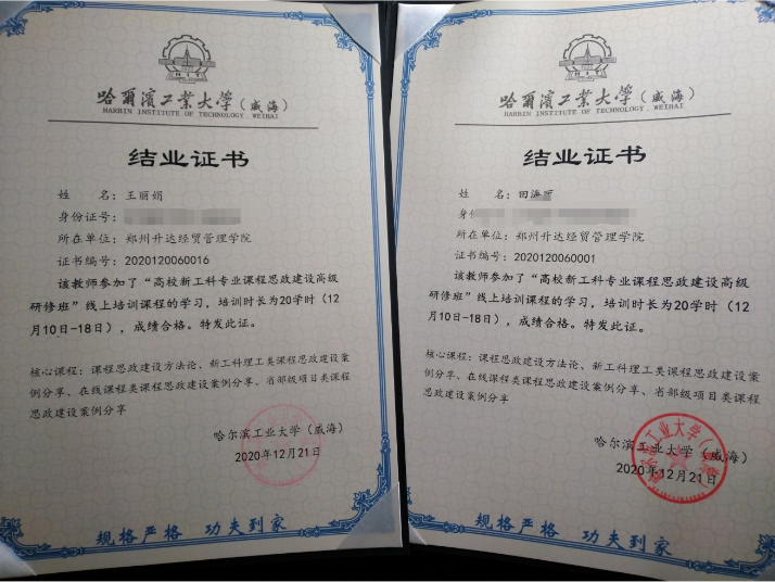 为贯彻落实习近平总书记关于教育的重要论述和全国教育大会精神,贯彻落实中共中央办公厅、国务院办公厅《关于深化新时代学校思想政治理论课改革创新的若干意见》,教育部于2020年6月1日发布的《高等学校课程思政建设指导纲要》指出,课程思政建设是全面提高人才培养质量的首要任务。全部推进课程思政建设,教师是关键。要推动广大教师进一步强化育人意识、找准角度、提升育人能力。基于此,2020年12月10日至12月18日,太阳成集团tyc122cc电信教研室王丽娟、田海丽参加了“高校新工科专业课程思政建设高级研修班”线上培训课程。