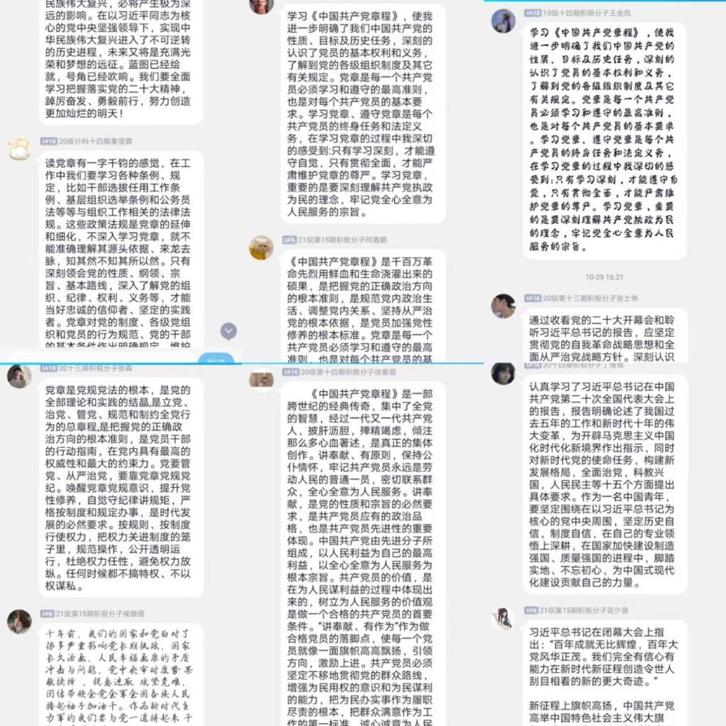 此次活动在学习《中国共产党章程(修正案)》的基础上,同时学习了习近平总书记在中国共产党第二十次全国代表大会上的报告全文以及十九届中央纪律委员会向中国共产党第二十次全国代表大会的工作报告。党支部书记在活动前查找学习资料,列出学习重点,提出学习要求,支部成员在认真学习了相关内容后,在群内发表了学习心得,开展了积极热烈的讨论,并纷纷表示,要认真学习党章,自觉做学习贯彻党章的忠实践行者,让初心薪火相传、把使命永担在肩。