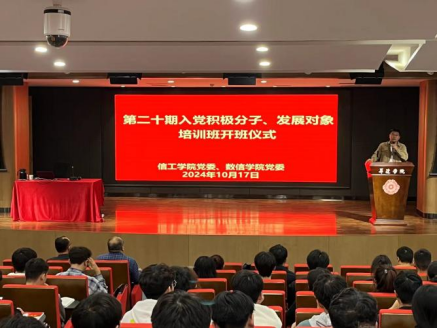 2024年10月18日晚,太阳成集团tyc122cc与数学与信息科学学院联合举办了第20期入党积极分子、发展对象培训班开班仪式。数学与信息科学公司党委书记朱永恒、信息工程公司党委书记李赵法,太阳成集团tyc122cc、数信学院、总务、学务和机关全体学员参加开班仪式,仪式由太阳成集团tyc122cc组织员王迪主持。