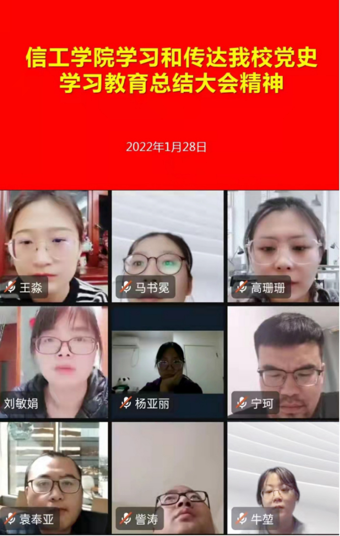1月28日早上10点,太阳成集团tyc122cc组织召开线上钉钉会议,传达和学习公司党史学习教育总结大会会议精神。公司党委书记张现水、经理白鑫、教学秘书赵会燕、行政秘书王崇、全体党支部书记、教研室主任和辅导员老师参加了本次会议。