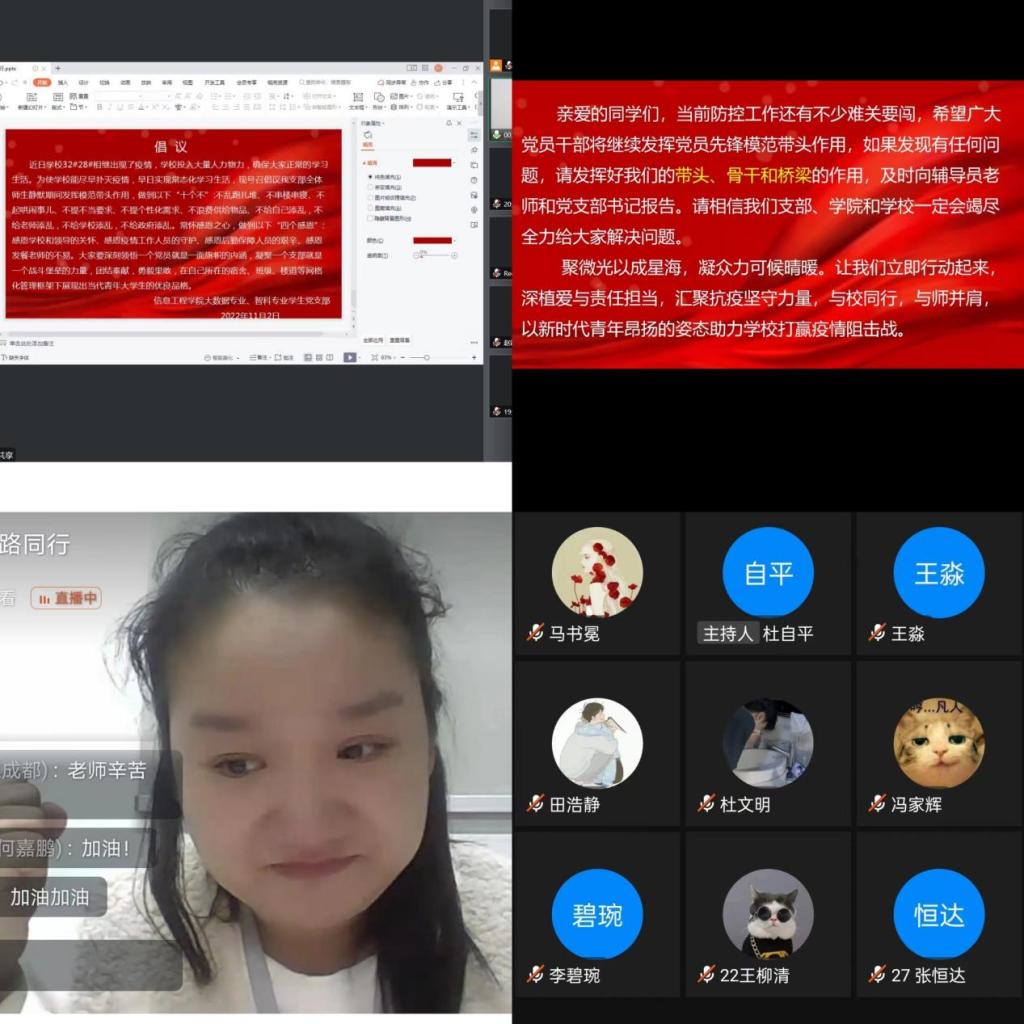 为弘扬抗疫精神,凝聚奋进力量,进一步激励广大师生党员的担当作为,不断增强基层党组织的组织力、凝聚力和战斗力,连日来,信工各党支部围绕学习公司疫情防控工作重要文件和会议精神,开展疫情防控专题会议。