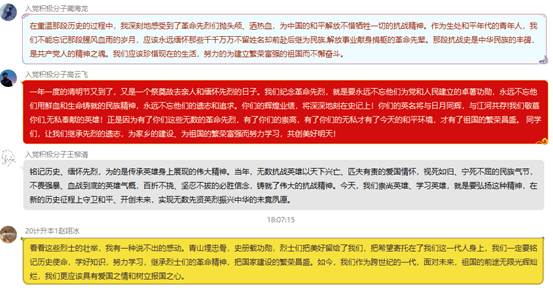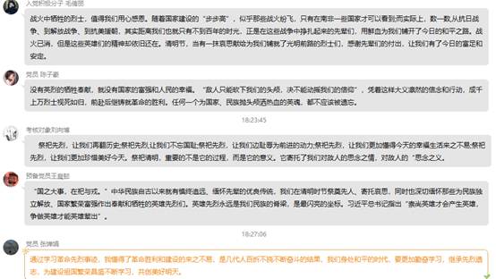 学习结束后,支部成员积极进行线上讨论,大家纷纷表达对革命先烈的敬仰之情和将革命先烈精神传承下去的决心。