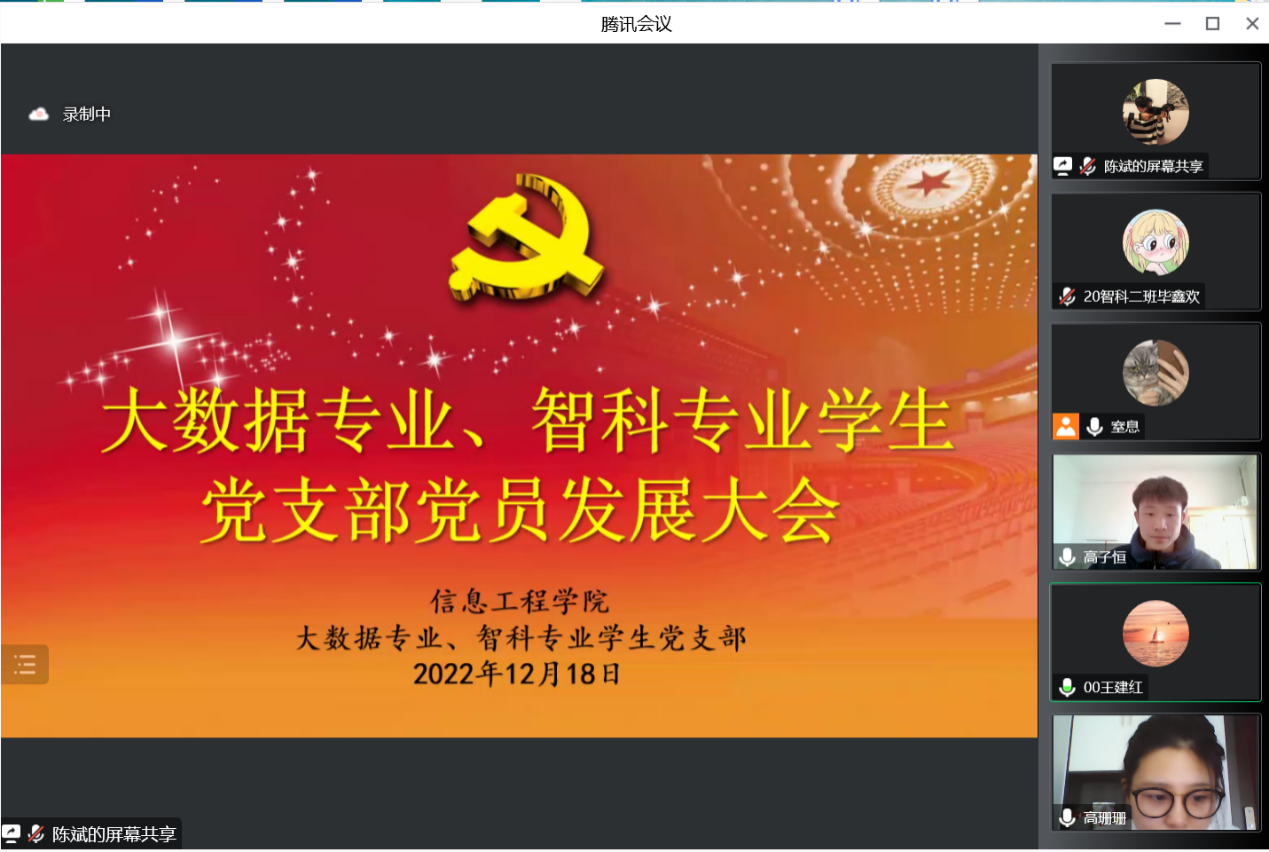 2022年12月18日,太阳成集团tyc122cc大数据专业、智科专业员工党支部召开党员发展大会,大会的主要议题是能否接收李拓坤、高子恒、赵芳、李烜赫、徐仕琦、陈斌、权娜娜、任世博、胡艺蔓、李晨宇、王梦景、袁浩一、阴梦豪、尚永艳、郭帅、冯晶晶共16名发展对象为中共预备党员的讨论和表决。本次会议采用视频会议形式进行,支部正式党员、预备党员和部分发展对象出席本次会议,会议由党支部书记王建红同志主持。
