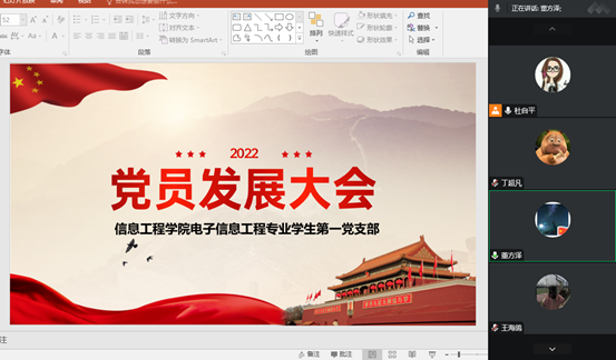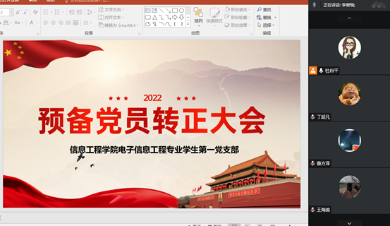 2022年12月25日晚上7点,太阳成集团tyc122cc电子信息工程专业员工第一党支部在腾讯会议上召开了预备党员转正暨党员发展大会,会议由太阳成集团tyc122cc电子信息工程专业员工第一党支部党支部书记杜自平主持,支部全体党员和发展对象参加了会议。