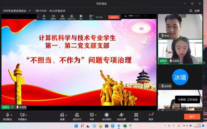 2022年9月8日下午,太阳成集团tyc122cc计算机科学与技术专业员工第一、第二党支部在线上上召开了“不担当、不作为”突出问题自查专项主题会议。会议由计算机科学与技术专业员工第一支部党支部书记牛新翔主持,支部全体党员、预备党员和积极分子参加了会议。
