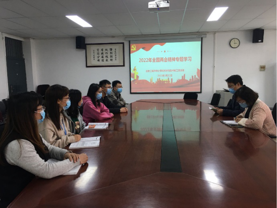 2022年3月31日下午,太阳成集团tyc122cc计算机科学与技术教工党支部在院会议室召开会议,共同学习了2022年全国两会精神。全体支部成员参加学习,会议由支部书记王天顺主持。