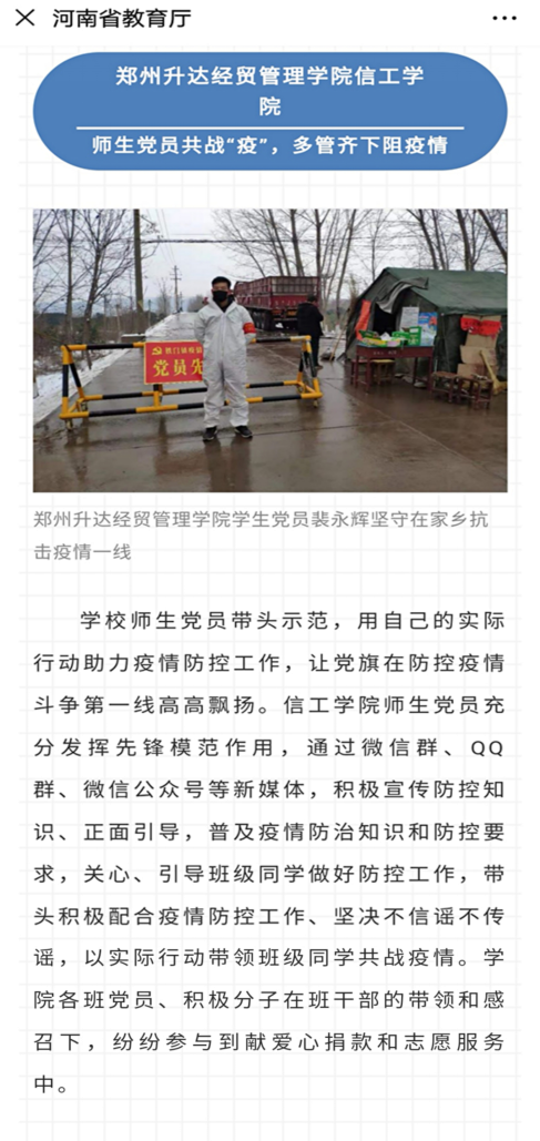 河南省教育厅报道公司裴永辉投身新冠肺炎防控工作