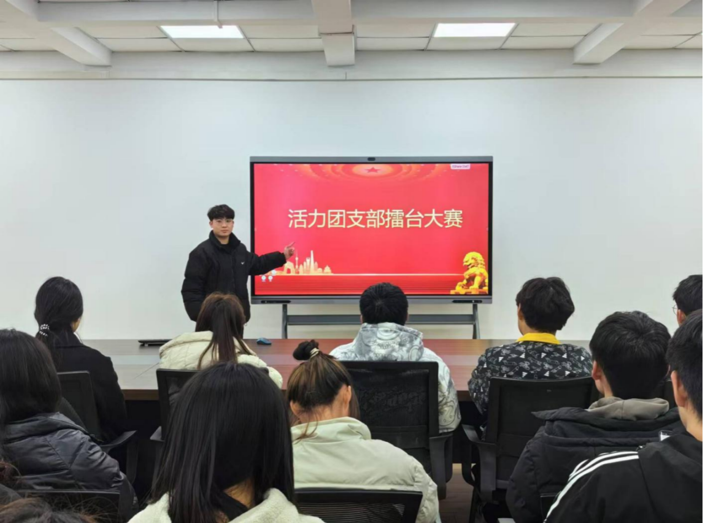 活动伊始,主持人开场致辞,拉开了活力团支部擂台大赛的序幕。各参赛团支部按照抽签顺序依次上台演讲,他们展示了团支部在过去一段时间内的工作成果、组织建设情况以及在社会实践中的突出表现。评委们认真聆听,并进行打分和记录。在评委打分期间,现场播放了红色主题视频歌曲,让在场的所有人都沉浸在红色文化的氛围之中。