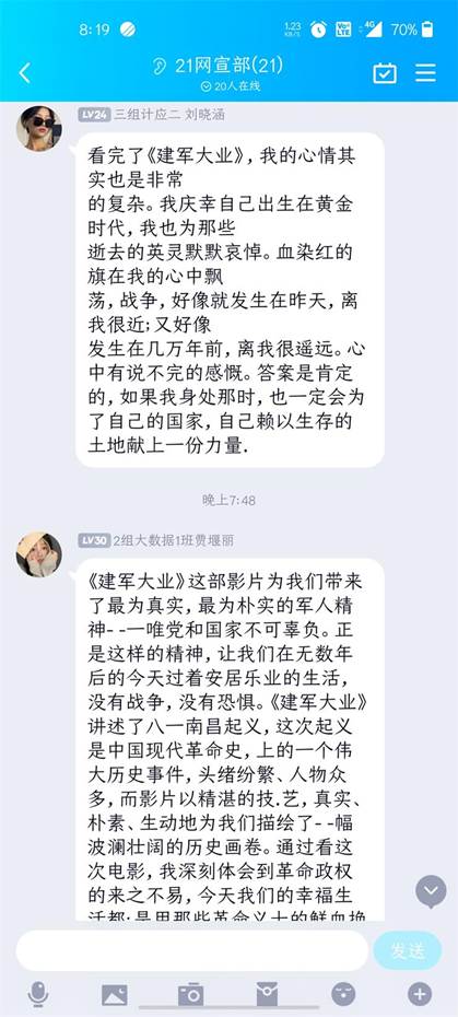 影片《建军大业》讲述了1927年第一次国内革命战争失败后,中国共产党为挽救革命,于当年8月1日在江西南昌举行武装起义,从而创建中国共产党领导的人民军队的故事。影片的每一刻都让人心纠、泪盈。手无寸铁的热血青年在用生命告诉人们,没有武装不行,没有人民的军队便没有人民的一切。同学们跟随影片仿佛回到了那段激情燃烧的岁月,深受影片触动和鼓舞,更被共产党人坚忍不拔的毅力和不屈不挠的爱国精神而震撼。同学们纷纷表示,要时刻铭记“天下兴亡,匹夫有责”,更要居安思危、胸怀天下,以革命先辈为榜样,时刻努力提高自己的综合能力,为实现中华民族伟大复兴贡献自己的力量!